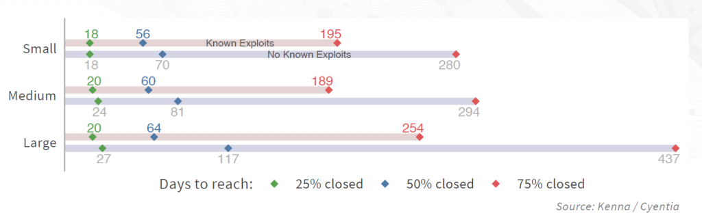 Unfortunately, the battle in patch management is far from over. Wade Baker (probably best known as the creator of the Verizon DBIR) found in the ‘Prioritization to Prediction‘ research reports that large enterprise could take up to 437 days to close 75% of known vulnerabilities in their environment. But there is light at the end of the tunnel. By leveraging prediction of exploration research to prioritise patching, Wade found that top performers in patch management can remediate the majority of their vulnerabilities 3X faster than the others: